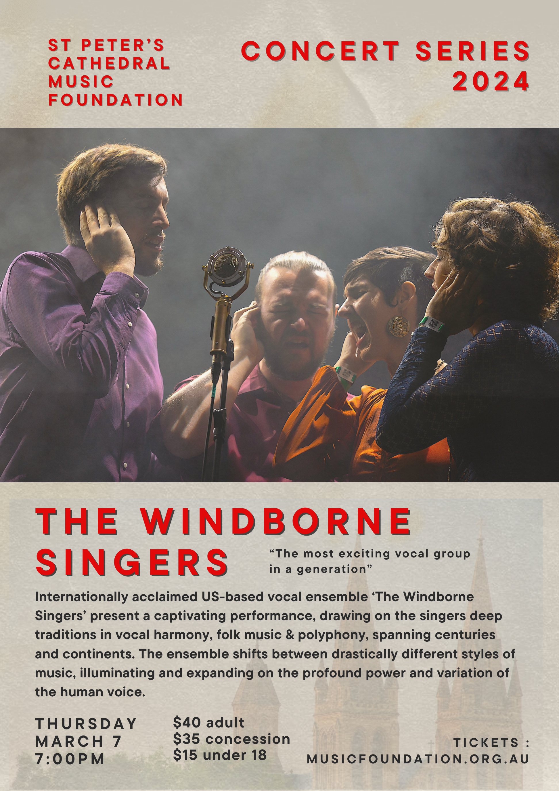 The first concert in the series is already announced - The Windborne Singers, a vocal quartet from the USA, who specialise in early polyphony and folk music from across centuries and continents. The Windborne Singers promise to be a unique, unusual and fascinating concert, in our wonderful Cathedral. If you haven’t grabbed a ticket to this yet, now is your chance - Thursday 7th March at 7pm.
