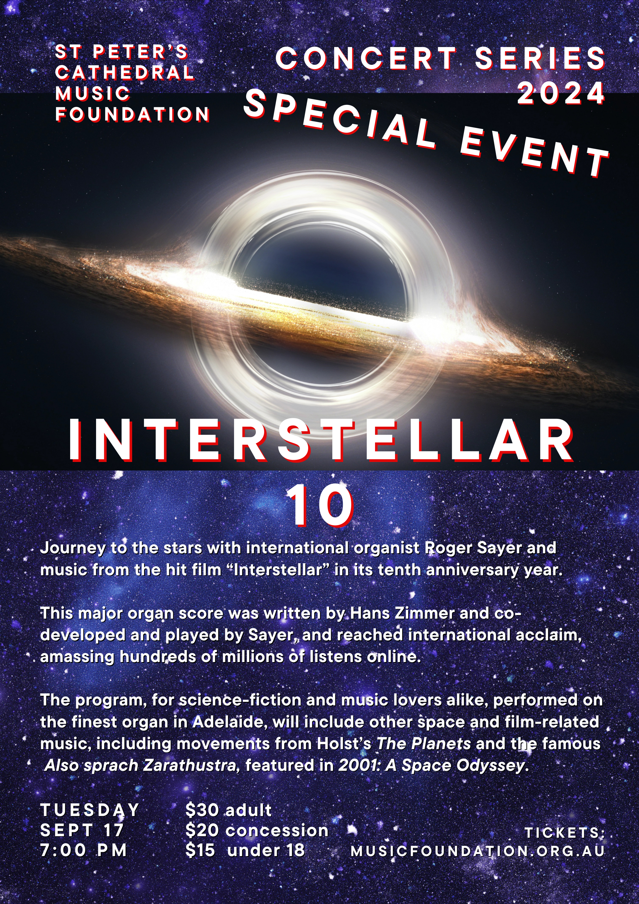 Don’t miss this rare chance to hear this extraordinary music, including an opportunity for Questions & Answers with Roger Sayer about the creation of the Interstellar soundtrack; all in the spectacular acoustical surrounds of St Peter’s Cathedral, with a large screen to see the organ being played.